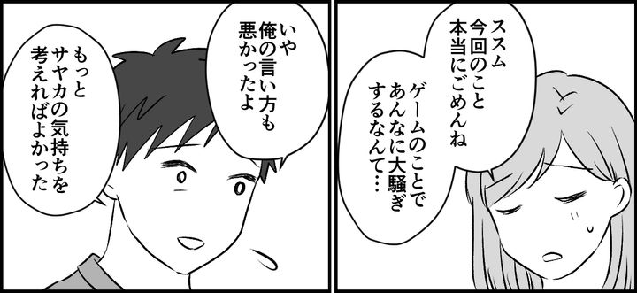 「もう少し冷静になるべきだった。ゲームぐらいで実家に帰るなんて、本当にやりすぎだったよね。お母さんに怒られちゃったよ」なんて、お互いに反省を述べながらこれからはゲームで喧嘩なんてするのはやめようと話し合いました。