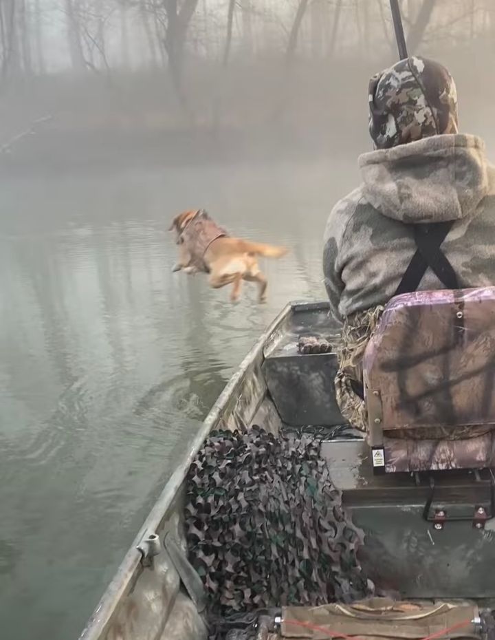 ボートから水の中に飛び込んで泳ぎはじめた犬。