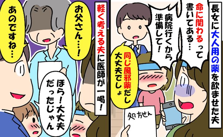 夫が5歳の娘に大人用の薬「大丈夫でしょ〜」命に関わるって書いてあるのに!受診すると医師が夫に一言