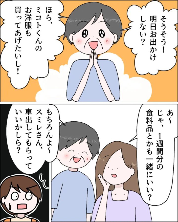 「そうそう、明日お出かけしない?」と、唐突に義母が提案しました。「ほら、ミコトくんのお洋服も買ってあげたいし。」イロハには一度も言ってくれたことのないことです。ミユキさんは「あ~。じゃ、1週間分の食料品とかも一緒にいい?」とすかさず言います。母親にそんなのも買ってもらう!?でも義母は「もちろんよ~」と嬉しそうなので、私が気にすることではなさそうです。関係ない話、と思っていると「スミレさん、車出してもらっていいかしら?」と当然のように義母に言われ驚きました。