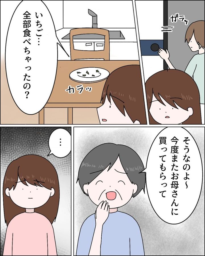 イロハがテーブルのお皿に気付き、「イチゴ・全部食べちゃったの?」と言うと「そうなのよ~今度またお母さんに買ってもらって。」とわざとらしい笑顔で義母が言いました。イロハは少し悲しそうな顔をしましたが、それ以上は何も言いませんでした。