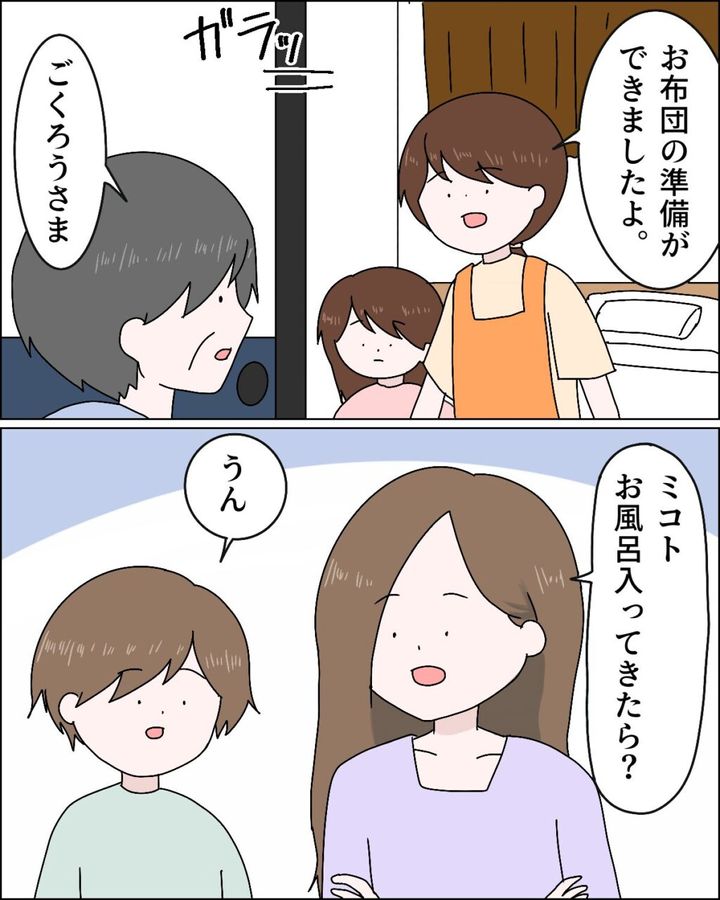 ミユキさんとミコトくんが泊ることになったので、義母に布団や泊る準備を命じられた私とイロハ。「準備ができましたよ」と声をかけて、ミコトくんはお風呂へ。