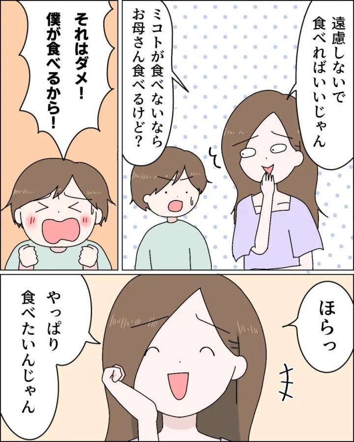 「遠慮しないで食べればいいじゃん」とミユキさん。「ミコトが食べないならお母さん食べるけど?」とけしかけました。すると慌てて「それはダメ!僕が食べるから!」と言ったミコトくんに「ほらっ、やっぱり食べたいんじゃん」と笑うミユキさん。