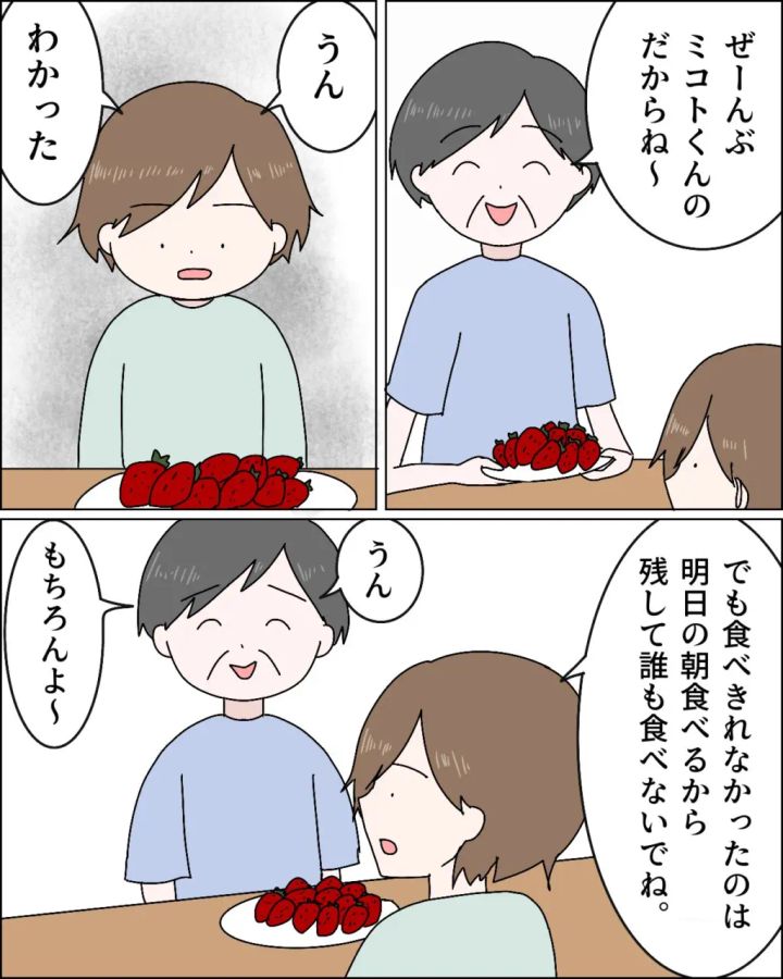 義母に言われて買ってきたイチゴ。こんなこと言いたくないけど、うちの生活費から出して買ったイチゴ。ミコトくんはイロハに「一緒に食べよう」と言ってくれていましたが、義母が私とイロハが席を外した隙にミコトくんにだけ食べてもらおうとイチゴを出したので優しいミコトくんは困惑していました。
