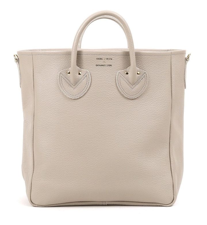 ベージュレザートートバッグL(31×30×14)/ヤング&オルセン ザ ドライグッズ ストア(グーニー PR) A4サイズも余裕で入る収納力。シンプルで上質がゆえに、どんな服にも合わせやすく長く活躍してくれる。レザーの品格はそのままに、シボ感と小ぶりの持ち手が、素材とサイズ感の重みを和ませる。