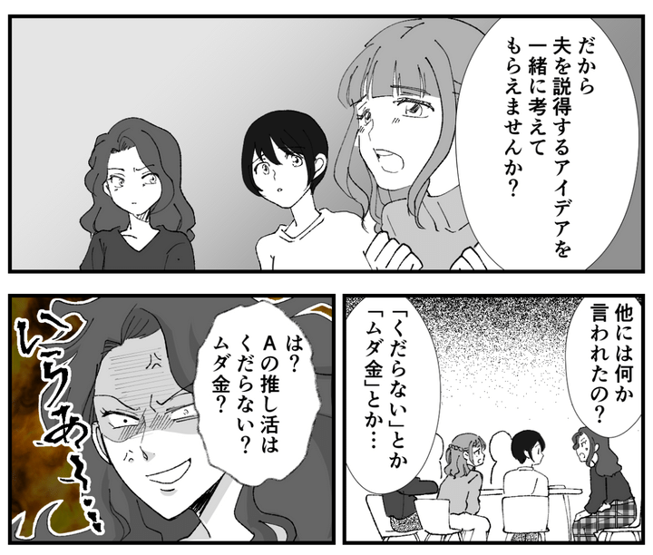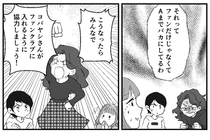 この日集まっているのはAの推し活仲間です。きっと全員、当然のようにファンクラブの会員だと思っていたのでしょう、コバヤシさん以外の全員が驚きを隠せませんでした。