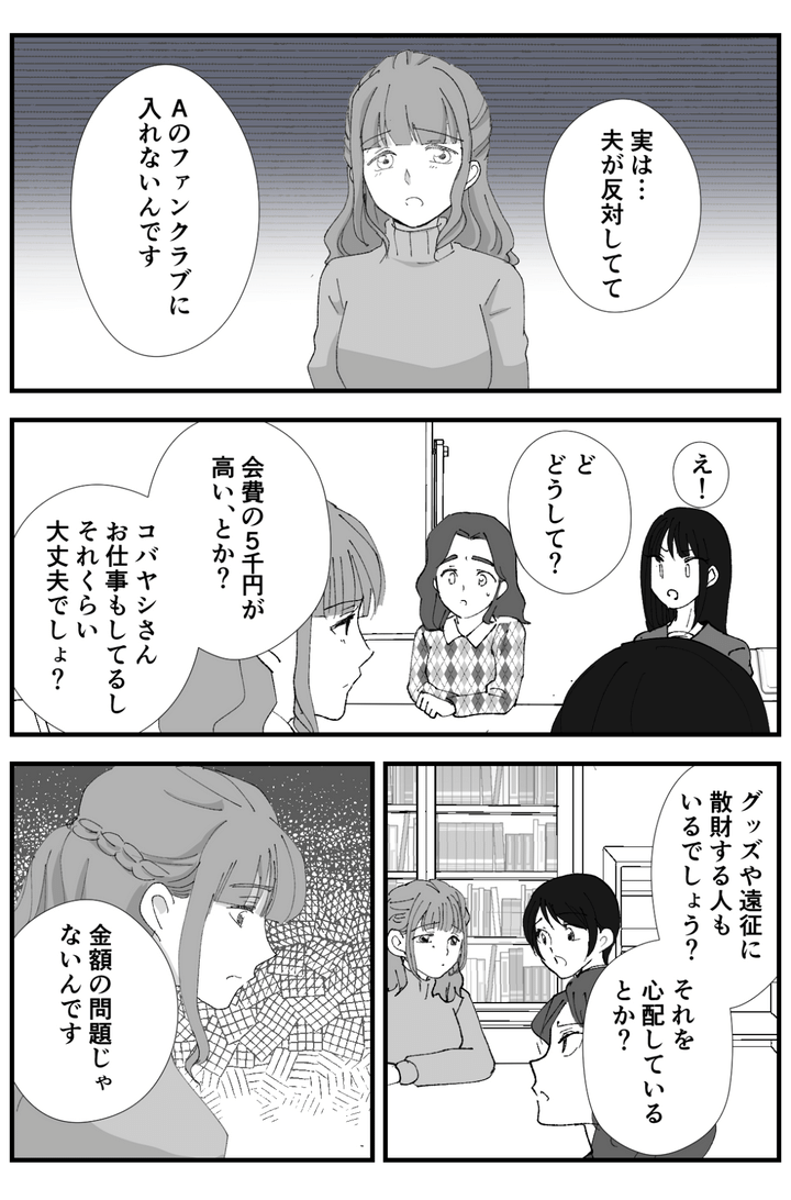コバヤシさんは夫が「心理的に受け入れられない、くだらない」と言ってAのファンクラブの入会を許可してくれないと打ち明けました。