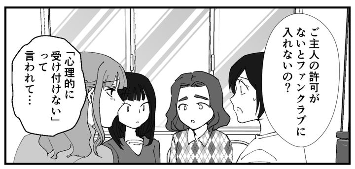 「心理的に受け付けない」ということを理由に、コバヤシさんは夫に、ファンクラブの入会を反対されているということでした。