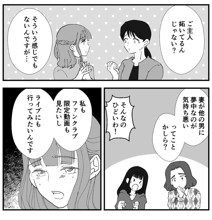 私(クミ、40代)は夫(ナオヒサ、40代)と長女(ナツメ、中2)、次女(アヤカ、小5)との4人暮らし。私と長女はとある男性アイドルAのファンで、ファンクラブに入会するほどハマっています。しかもママ友たちにもAのファンがいるとわかったのです! 私はキムラさん(40代)に誘われて、ママたちによるAファンの集い(集会)に参加しました。集会が盛り上がるなか、コバヤシさん(30代)からの相談で場の空気が一変します。