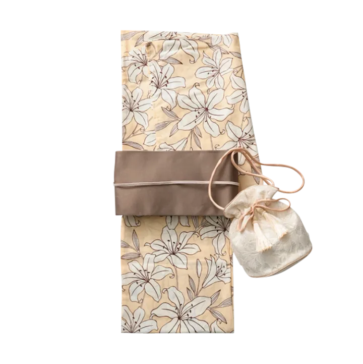 クリーム花柄浴衣と帯のセット 9,990円、帯締め 1,590円/ともにSOBIEN(きもの館創美苑)巾着バッグ 参考商品/ふりふ