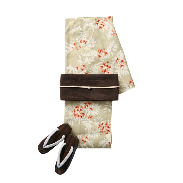 赤い実柄浴衣 27,500円、茶帯 19,800円、三分紐 6,600円、帯留め 11,000円、下駄 参考商品/以上きものやまと(やまと)