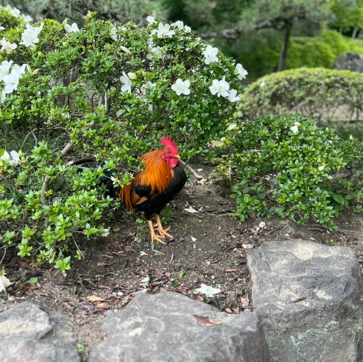 そして神宮前駅に着いたら、あることに気づきました。こちらは東門が近くて正門まではかなり遠く、全然いいルートじゃないってことに(笑)。何かと遠回りをする人生なので、これも筆者らしいと思っていたら、このルートが正しかった出来事と遭遇したんです。正門まで歩いていると植木に向かってカメラを向けている人がたくさんいたので、「なんだなんだ! 」って野次馬根性で近づいてみると、そこにいたのはニワトリ。珍しいのか縁起物なのか、まわりの人に聞いてもわからずだったのですが、すごくカッコいいニワトリだったので、思わずパチリ。