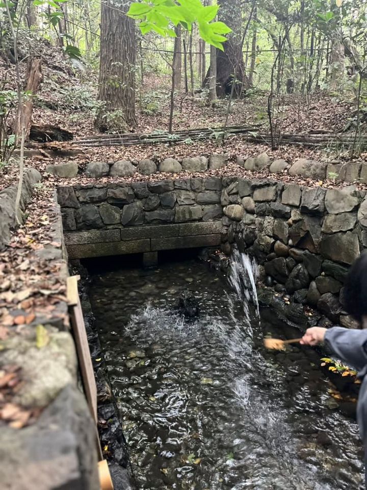 続いて、水の神様である罔象女神をお祀りしている清水社へ。社の裏手に湧水があるのですが、柄杓で水をすくって中心の石に向かって3回水をかけると願いが叶うといわれているそう。早速チャレンジしたのですが、意外にも難しくて、ぜんぜん水がかからない! 本当は3回中の1回でも水がかかったらいいでそうですが、このときは3回水がかからないと願いが叶わないと思っていたので、たぶん20回以上やったと思います(笑)。一人でジタバタして並んでいる方にも笑われたので、もう1回並び直すことに。で、みなさんを見ていたら、3回しか水をかけていないことにようやく気づき(笑)、次は集中して3回だけ水をかけて、一度だけ見事命中。この水で肌を洗うとキレイになるとのことだったので、肌にパッティングしておきました。最近10年以上ぶりの友だちと会う機会が多いのですが、みんなに「肌がキレイ」って褒められるのは、この湧水でパッティングしたからかも!