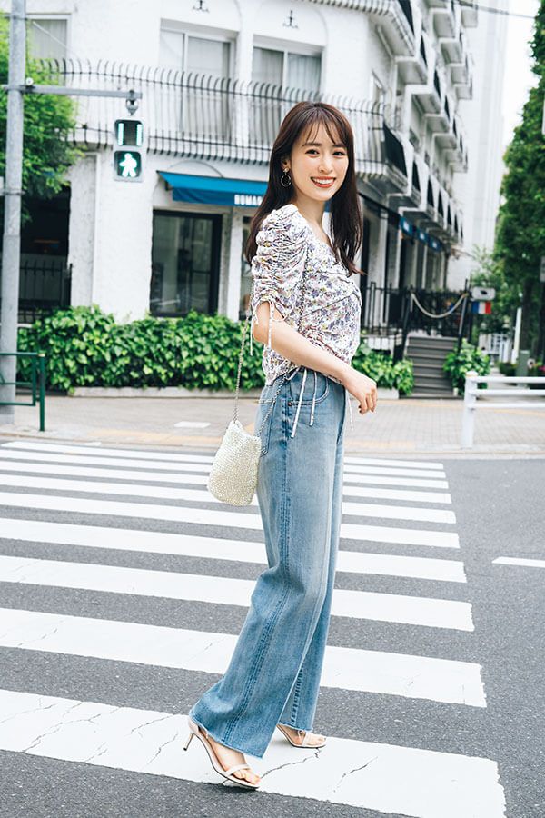 3. 二の腕カバーと着映えの叶う【シャーリングブラウス】!甘トップス×デニムで大人のフェミカジュに