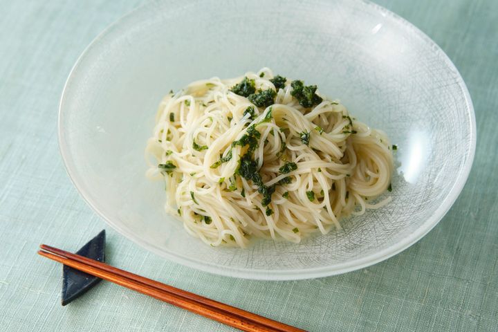 そうめんをゆでて水で洗い、水けをよく絞って、しそジェノベーゼをからめるだけ。夏のランチメニューにおすすめです。