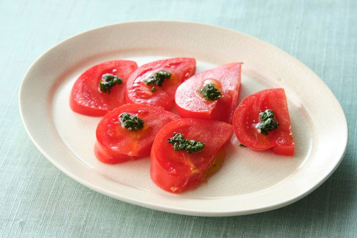 しそジェノベーゼは、ドレッシングとしても重宝。薄切りにしたトマトにのせれば、気のきいたおつまみになります。