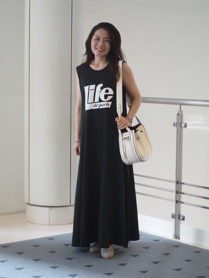 大の暑がりというフジワラさん。「思い切って肌を出して、ヘルシーな夏の装いを楽しんでいます。なかでもワンピースは風通りがよく、コーディネートも楽ちん。この時季の定番アイテムです」。胸元に大胆にあしらわれた白いロゴが、ほどよいカジュアル感と遊び心をプラス。