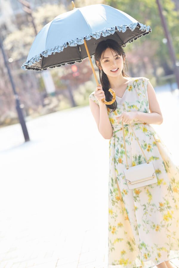 フリルたっぷりの傘でイエローのフラワーを一面に咲かせたワンピの可愛らしさを底上げ♡