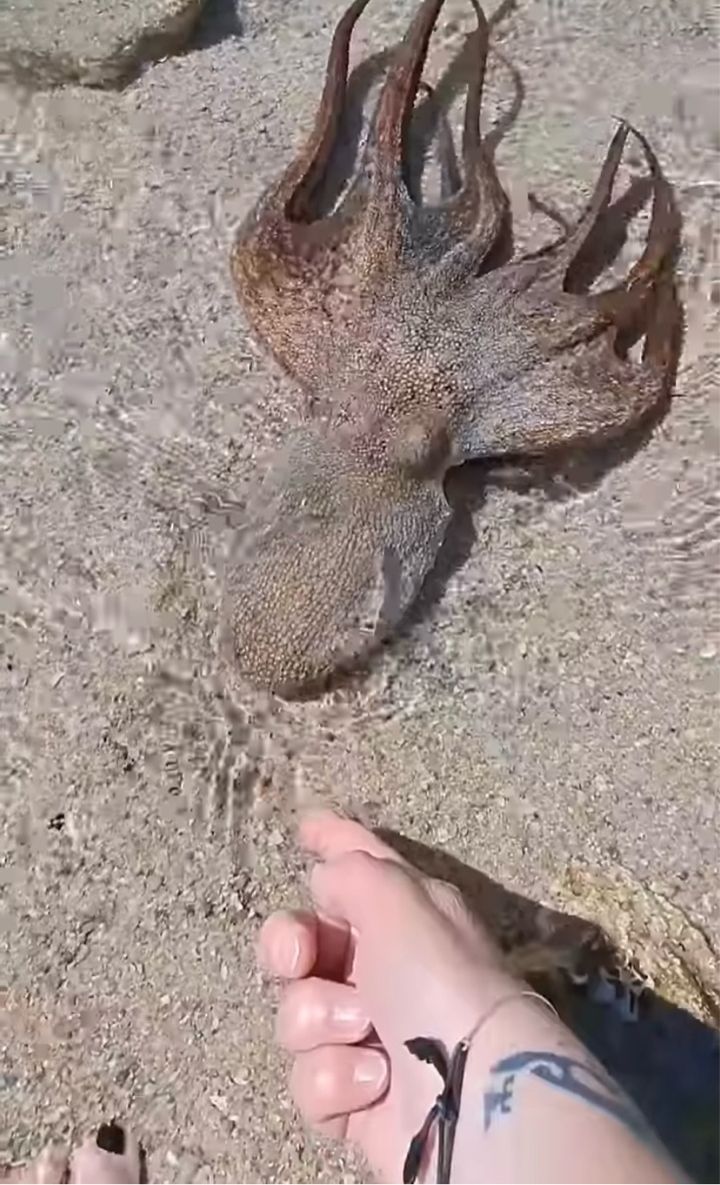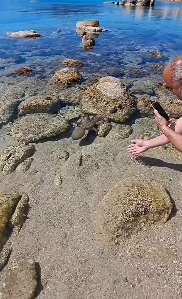 海水浴中に浅瀬でタコを発見した撮影者さん達。 驚いたことに、このタコは人懐っこい行動を見せてくれたのです!