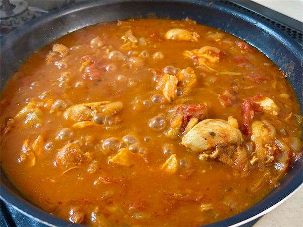 9. 水分が減ってペースト状になったら、1の鶏肉を入れて軽く炒め合わせ、水を加えしっかりと馴染ませます。フタをして弱火で15分煮込みます。
