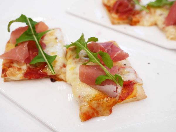ポテトチップス同様、ビールによく合うピッツァ・マルゲリータも、ちょうどよいサイズで美味しい! ヒューガルデンロゼのカラーとリンクした、生ハム(プロシュート)のトッピングもおしゃれです。