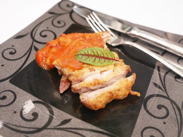 メインディッシュは、鶏肉のディアボラ ピペラードソース(写真は2人分)。 しっとりジューシーな鶏肉にパプリカとトマトのピリ辛ソースが添えられた、夏らしい一品です。