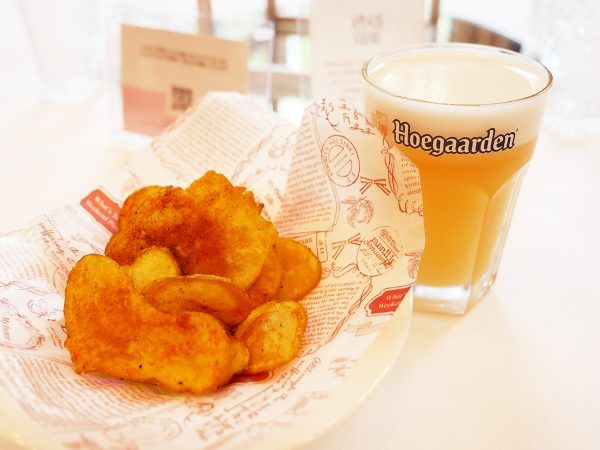 定番のヒューガルデンホワイトは、生ビールでの提供です。 燻製ブラックペッパーとパプリカの香りをまとったポテトチップスは、コリアンダーシードが香るヒューガルデンホワイトとの相性抜群!(写真のポテトチップスは2人分)