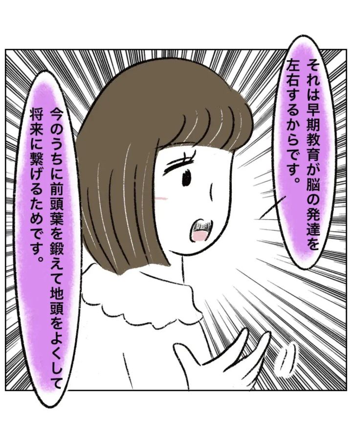 理由を聞かれたゆかちゃんママは「それは早期教育が脳の発達を左右するからです。今のうちに前頭葉を鍛えて地頭をよくして将来に繋げるためです」とスラスラと熱弁。