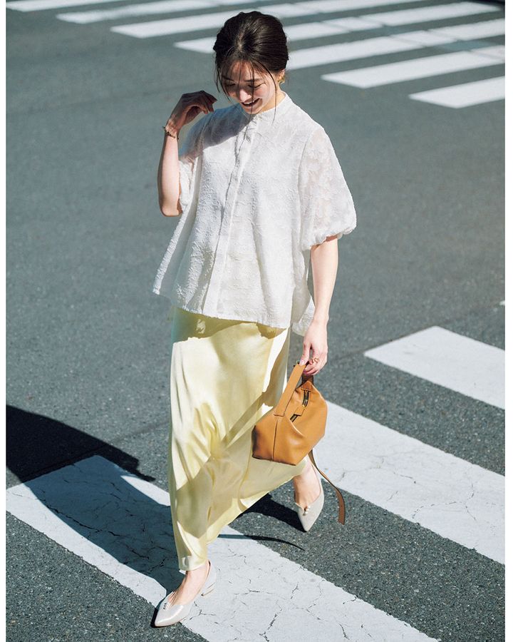 ブラウス¥15,400(スリースクエア)スカート¥16,500(アルページュストーリー)シューズ¥23,650(タラントン by ダイアナ/ダイアナ 銀座本店)ピアス¥3,740(ヘンカ/ロードス)バングル¥24,200(オンブル ビジュー/フォーティーン ショールーム)リング¥26,400(プラウ)バッグ/スタイリスト私物