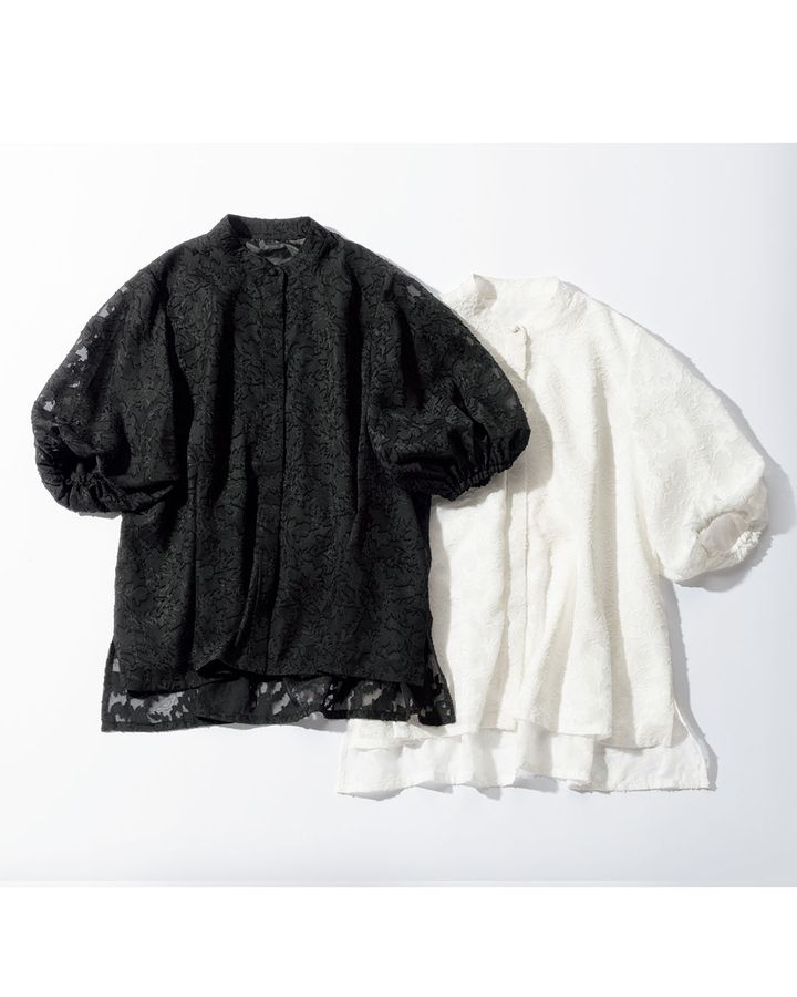 膨らみのあるジャカード織りのお陰で二の腕が透けすぎない大人のシアーブラウス。ボディ部分は裏地が付いているので、インナーの心配は無用。少しゆったりとした着心地で、細めのパンツとも高相性です。