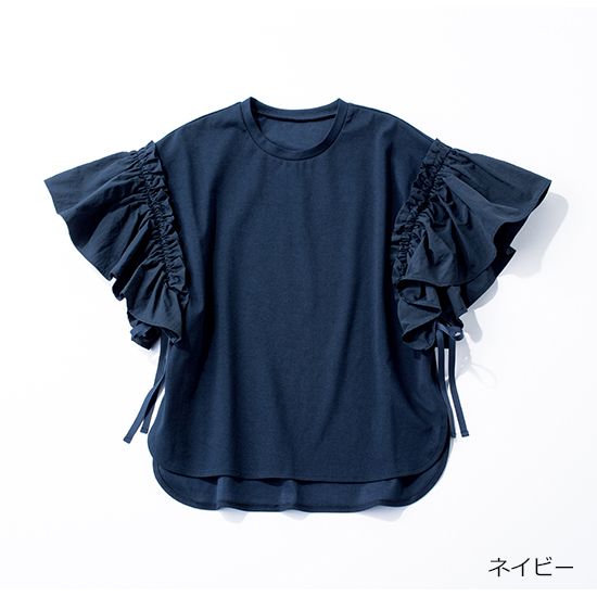 幾重にも重ねたフリルスリーブがポイント。インしてもアウトしても着やすいように、ラウンドカットし前後差を付けました。後ろはV開きにカットされていて抜け感が出ます。
