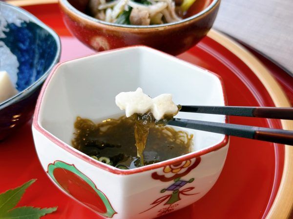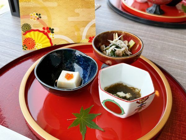 「もずく酢」には金魚を模った長芋が入っており、シャキッと食感もあります。小鉢3種は見た目にも涼やかで、今から始まる和食コースへの気分を高めてくれます。