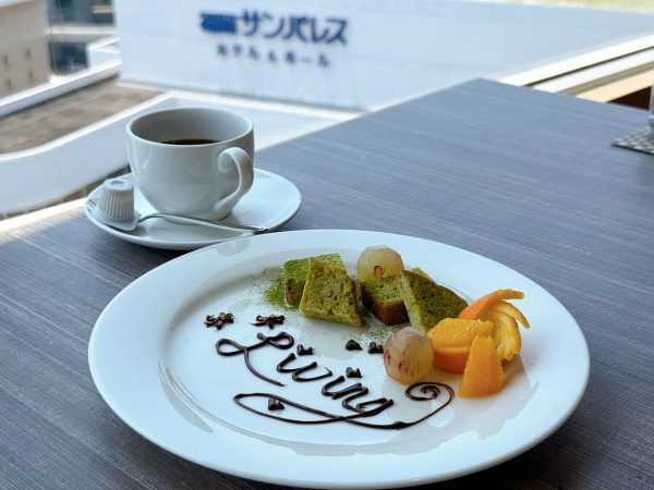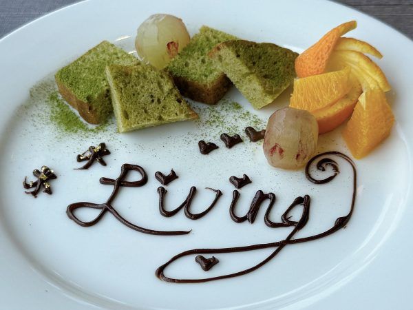 実はこの『本日の甘味』は事前に相談をすると、写真のようにデザートプレートに無料でメッセージを添えることができます。ちょっとしたお祝いのシーンや、感謝の気持ちを伝えたいときにもぴったりのサービスですね。今回「Living(リビング)」と入れていただきました♪