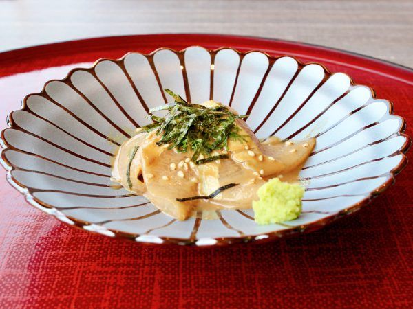 福岡といえば「ごまさば」ですが、この日の胡麻和えには、志賀島直送の新鮮な「ひらす」を使用。甘めの胡麻だれが絡み、ぷりっとした身の弾力が口の中に広がります。ごはんが欲しくなるおいしさです。ちなみに「ひらす」は、標準名「ヒラマサ」の地方名です。