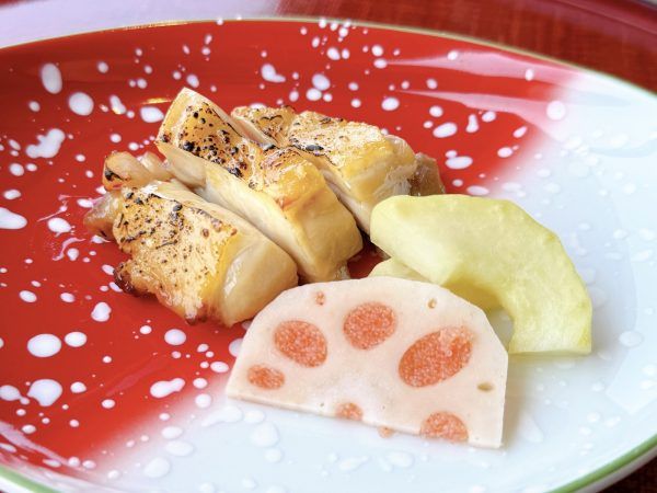 続いては『九州産鶏もも肉の西京みそ焼き』。しっとりジューシーな鶏もも肉を、香り高い西京みそでじっくり焼き上げた一品。熱々で中はふっくら、まろやかな甘みとみそのコクが味わえます。