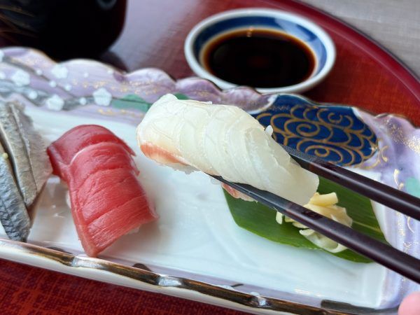 お待ちかねの寿司タイム!この日の志賀島直送は「鯛」です。鯛をはじめ、「まぐろ」「酢締めのいわし」「ほたて」「えび」の握りが美しく並びます。