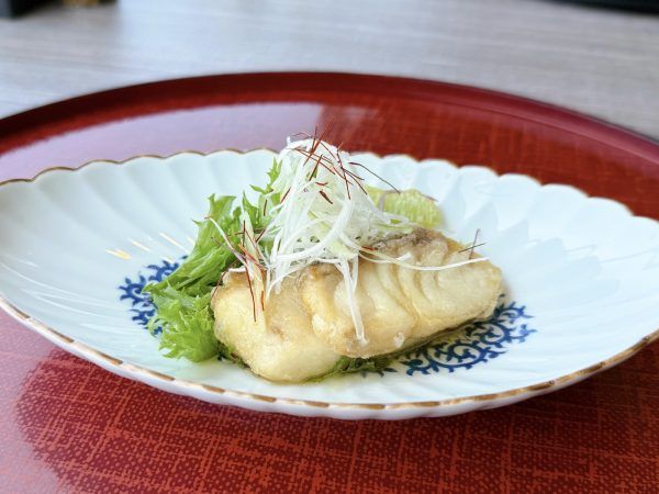 『旬魚の竜田揚げ』に使用されたのは真鯛です。揚げたての香ばしさとともに、魚の旨みがじゅわっと口いっぱいに広がります。後味もさっぱりとしていました。