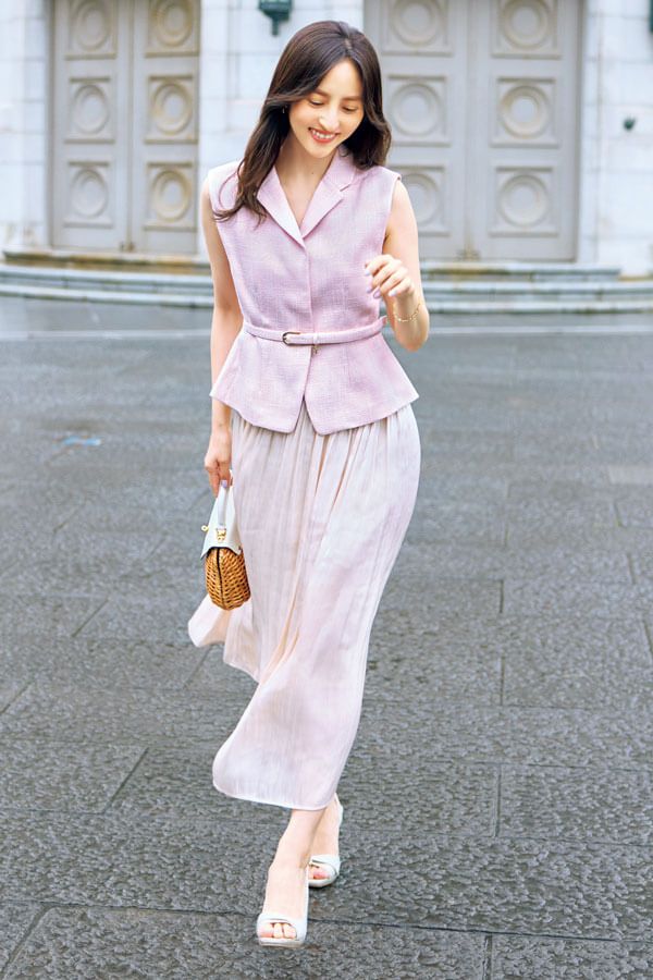 爽やかな甘さが魅力のパステルツイードで、夏の着こなしをぱっと華やかに♡ 色が淡めなぶん、デザインはきりっと都会的なものを選ぶのがポイント。スカートもピンクトーンで繋いで女性らしい雰囲気に。ジレ×落ち感スカートが作る縦ラインでスタイルアップも叶えて。