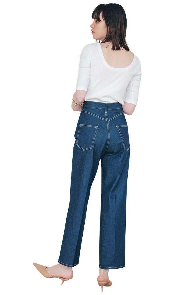 組み合わせも、アイテム自体もごく定番。どちらもカジュアルな服だからこそ「甘さ」を装飾ではなく「形やデザイン」でさりげなく投入。コンパクトなリブトップスに、ヒップラインもキレイに出るハイウエストのブルーデニム。この2つだけで自然体、だけど女性らしい雰囲気。