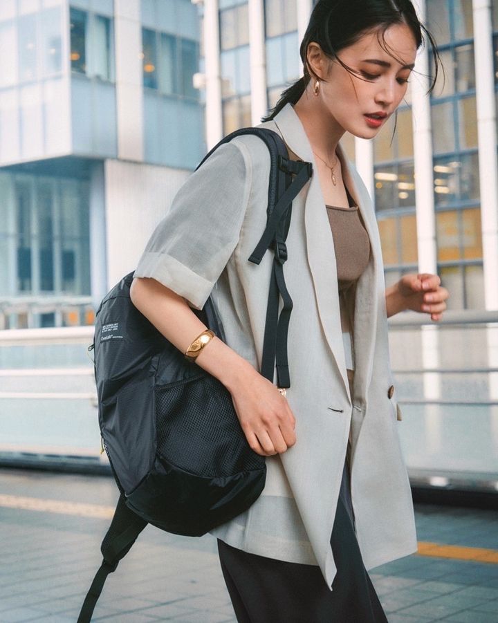 ジャケット¥17,000(PLST)半袖ニット¥20,900(エイチ ビューティー&ユース)スカート¥19,800(コンテ/コンテ青山店)バックパック¥12,100(オーバーラボ/キャビアプロダクツ)ピアス¥110,000(モニス/フォーティーン ショールーム)ネックレス¥10,560(チビ・ジュエルズ/チビジュエルズ・ジャパン)バングル¥30,140(ソコ/ZUTTOHOLIC)