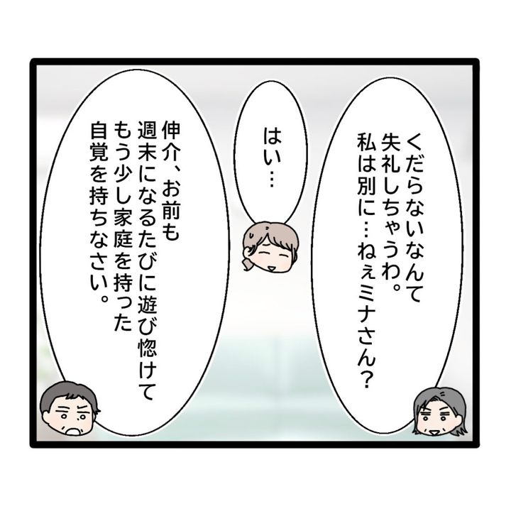 週末実家に帰ると話した途端、ミナさんを否定する義母。すると帰って来た義父が聞きつけ義母を注意。伸介さんにも注意した後、食欲がなく、部屋で味噌汁だけ飲むと話す義父を、「最近、特に忙しそう・・」と心の中で呟くミナさん、義母にしっかり注意してくれた義父の体調が心配ですが、義父の言葉がちゃんと響いていることを願うばかりです。