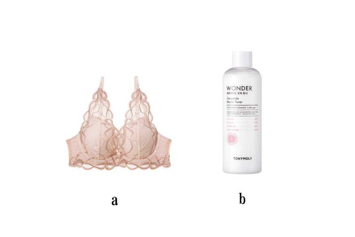 「ワンピのシルエットを左右するデコルテのライン。キレイに見せるには、ピーチ・ジョンのナイスバディブラ一択! 肌の保湿も化粧水でしっかりと。」