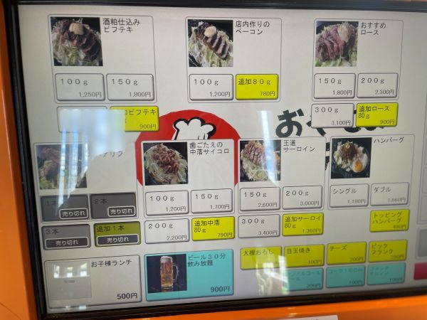 ビフテキ、ベーコン、中落サイコロなどは前回同様のラインナップ。 光の具合で判別し難いですが、左下のメニューが全て「売り切れ」の表示。 大将に、これは何?お値段は?と質問したところ券売機を操作して見せて頂きました。