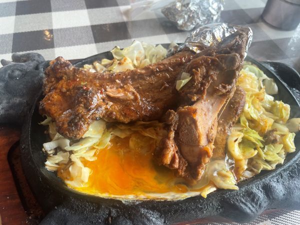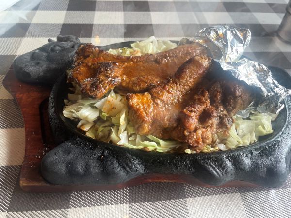 熱々で提供された大将渾身の力作の登場です。 たっぷり盛られたキャベツの上に、これぞ肉!の存在感。骨付で300g位とのこと。 醤油、みりん、にんにく、豆板醤をベースとした漬け汁に一晩漬け込み、10時間かけて低温調理するなど、相当な手間と時間をかけているそうです。