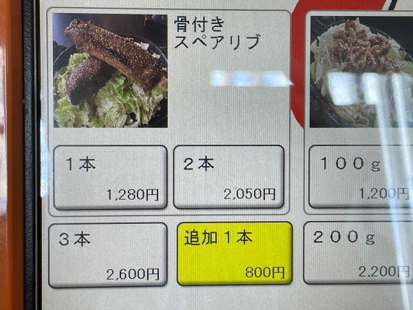 お値段は1本1,280円。これはビフテキ、中落サイコロと同額の設定です。 ステーキ100g(ライス、スープ付)に、「骨付きスペアリブ」1本追加だとプラス800円とのことです。 新作の「骨付きスペアリブ」で、超お薦め!の一品とのことですが、食べられないなら「仕切り直しだ!」