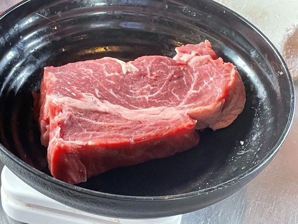 次のオーダーで軽量中のビフテキ100g。 厚み良し、脂肪の入り具合良し‥。きっと美味しく仕上がるんでしょうね。