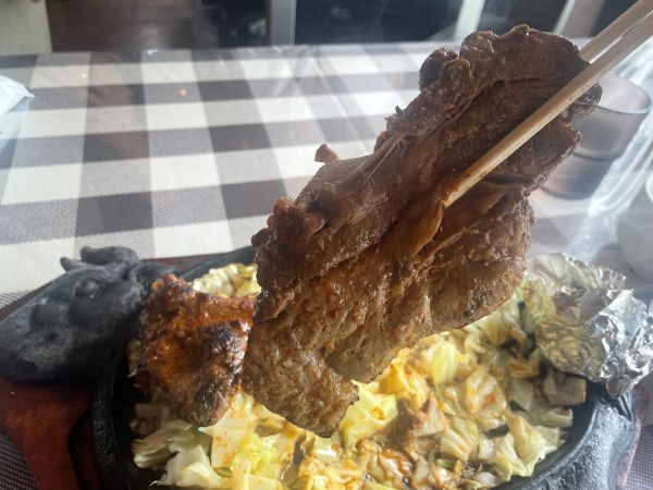 醤油、みりん、ニンニク、豆板醤の最強の組合せから成る漬け汁に漬け込んであるので、美味しいこと間違いなし! 本日は、生卵(100円)を別皿で注文。鉄板に作った空地に半熟状態でお肉の登場を待ちます。 それこそ、お箸で簡単に崩れる「とろっとろ」のお肉を、半熟卵に絡ませて白米と一緒に頂きました。 そう、豆板醤とニンニクでパンチの効いた焼肉丼が完成しました。