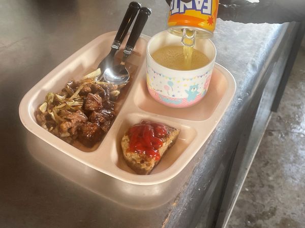 サイコロ肉とキャベツ、もやしをやさしい味付けで炒めたもの、ケチャップがかかったハンバーグ半分、オレンジジュース。お子様大満足間違いなし!