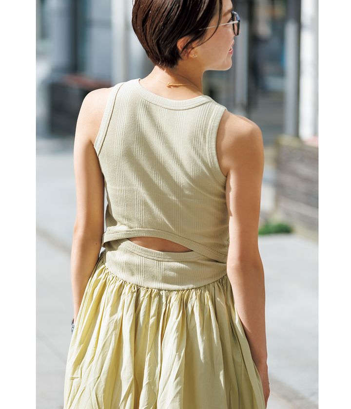 アメスリ・背中チラ見せワンピは、好きなパーツである二の腕と背中をキレイに見せてくれるカッティングデザインとライムカラーに一目惚れ。ショートヘアに華奢な体型でも異素材なら女っぽさも足してくれるから気分も上がります。