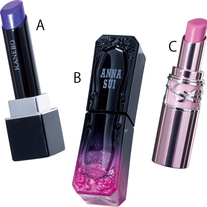月明かりに照らされたように幻想的なヴァイオレットピンクに、ブルーとピンクのパールが揺らめく。KANEBO ルージュスターヴァイブラント EX10 ※限定色 ¥4,620(カネボウインターナショナルDiv.)